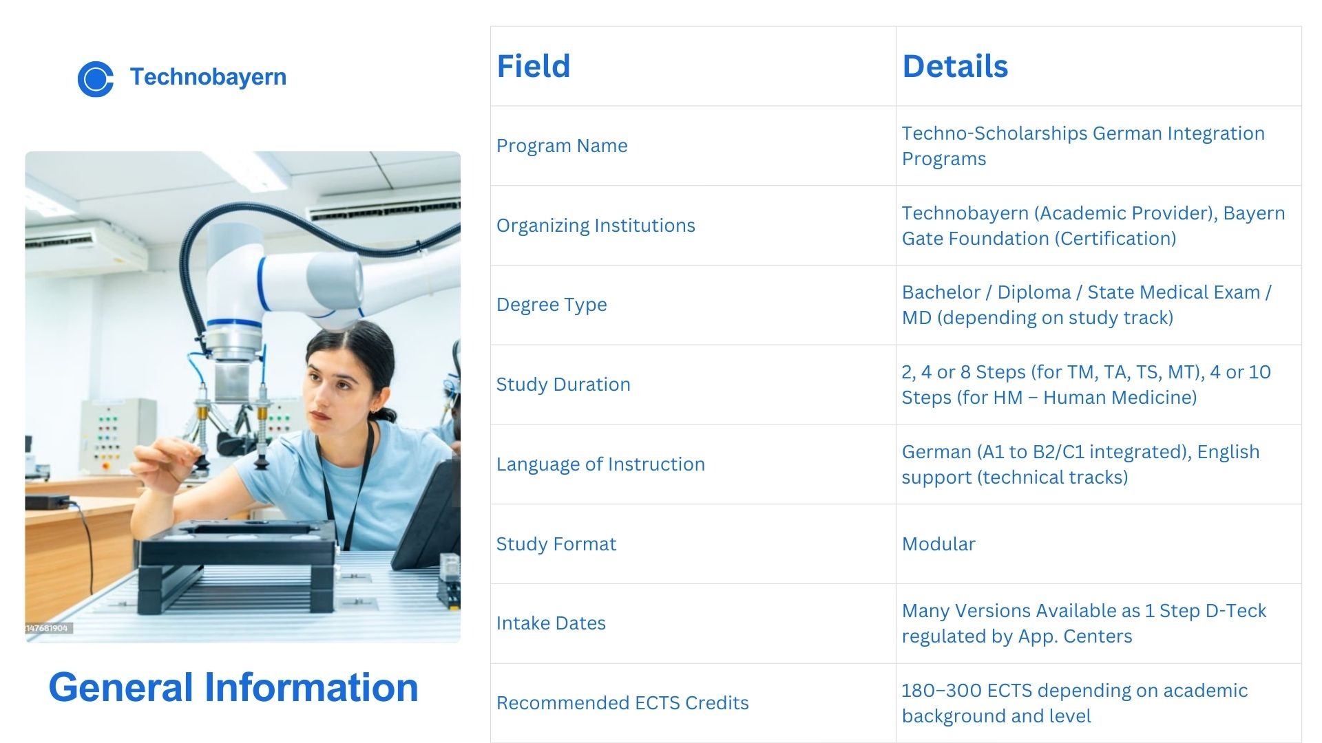 Technobayern Germany offers a structured portfolio of technology-focused diploma programs designed to meet academic standards and industry skill requirements across Artificial Intelligence, Machinery Technic, Medical Technology, and accelerated Quick Programs, providing learners with comprehensive training aligned with German and global workforce needs. The Artificial Intelligence curriculum includes the multi-level Technobayern AI Advanced Diploma, emphasizing applied machine learning, neural networks, automation systems, Python programming, TensorFlow, Scikit-Learn, model evaluation techniques, and capstone-level project deployment. The Machinery Technic program delivers foundational and applied instruction in mechanical engineering systems, industrial automation, machinery operations, engineering safety standards, and technical simulation exercises modeled on German industrial practices. The MTID Germany program in Medical Technology and Digital Health integrates scientific and technological competencies by introducing digital diagnostics, healthcare informatics, medical device fundamentals, EU medical-tech regulatory principles, and the application of AI in clinical and diagnostic workflows. Complementing these core programs, Technobayern’s Quick Programs offer short-duration, competency-based modules designed for rapid upskilling in areas such as Python fundamentals, introductory machine learning, health-tech essentials, and machinery safety procedures. All programs incorporate structured learning outcomes, evidence-based instructional design, guided academic progression, and practical assignments, ensuring that graduates acquire measurable technical competencies and the applied proficiency necessary for successful integration into contemporary technology sectors.